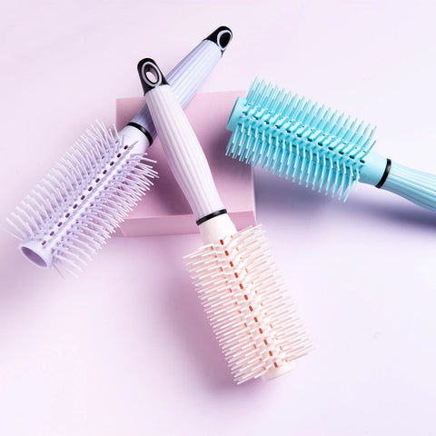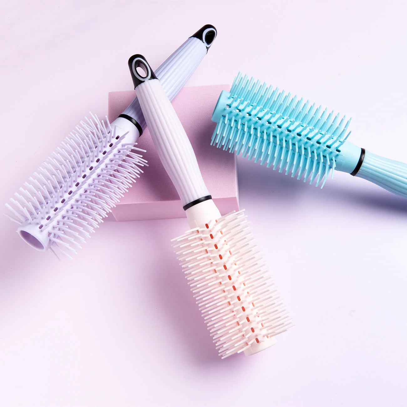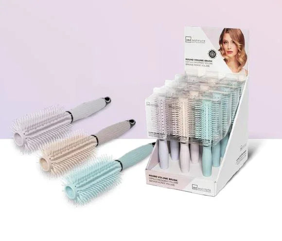Round shaping brush. It works with the heat of the dryer to shape the hair during styling, adding body and volume. Its ventilated body allows air to flow freely and ensures soft and shiny hair. Available in pink, lilac and blue.