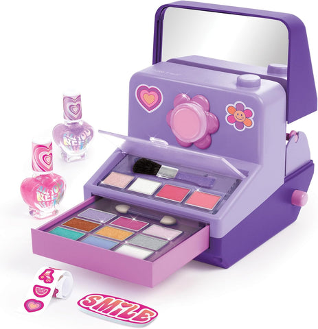 INTERACTIVE DESIGN: Shaped like a camera, the case adds a fun, interactive element. Press the button to reveal a pop-out tray with additional makeup compartments, enhancing the play experience.